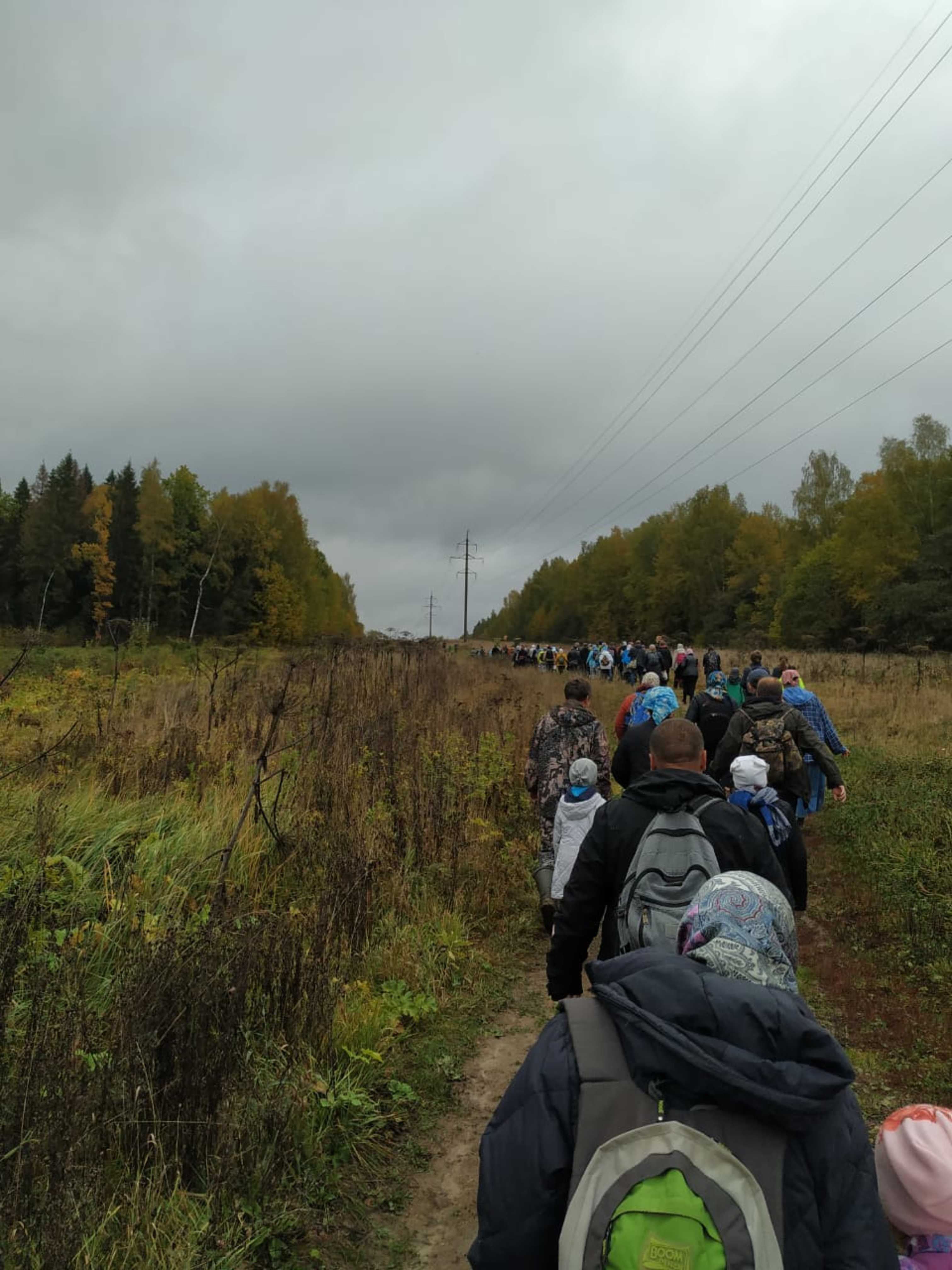 Далее объединенная группа направилась к Сергиевскому храму в микрорайоне Семхоз. В этом году, как и в прошлом, было принято решение идти в обход по Филимоновской дороге, которая проходит через красивые, свежевспаханные поля, деревню Матрёнки и дачные поселки, раскинувшиеся по границе осеннего леса.