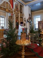 Утром 7 января была совершена Литургия Иоанна Златоуста. Служба проходила в главном алтаре, в храме присутствовали практически все наши постоянные прихожане и те, кто имеют возможность приходить только на большие праздники. На праздничной службе пел молодежный хор под руководством регента Христины Одяковой. На службе были исполнены: